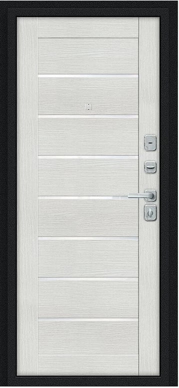 Надежная входная Дверь Браво Техно/BChrome Букле черное/Bianco Melinga премиум класса по цене 30 500 руб. Большая толщина стали защитит от проникновения в ваш дом, квартиру или коттедж. Используется очень качественная фурнитура: замки, цилиндры, ручки, защелки. Покрытие и отделка двери изготовлено под внимательным контролем производителя. Дверь имеет долгий срок службы и гарантию.